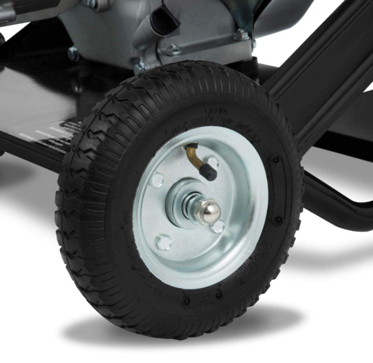 Il tubo ad alta pressione lungo 7,5–8 metri assicura un ampio raggio d’azione, mentre le ruote robuste facilitano il trasporto anche su terreni irregolari.